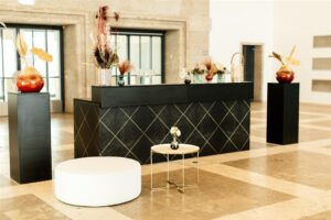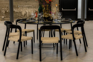 In Kombination mit unseren runden Lunar-Tischen in Schwarz (160 cm Durchmesser) entsteht ein Setting, das zeitlos und edel zugleich wirkt. Die samtig-grüne Polsterung von Miko bildet einen eleganten Kontrast zur klaren Linie des schwarzen Tischdesigns und schafft ein stilvolles Ambiente – perfekt für besondere Anlässe, bei denen Eleganz und Stil im Vordergrund stehen.